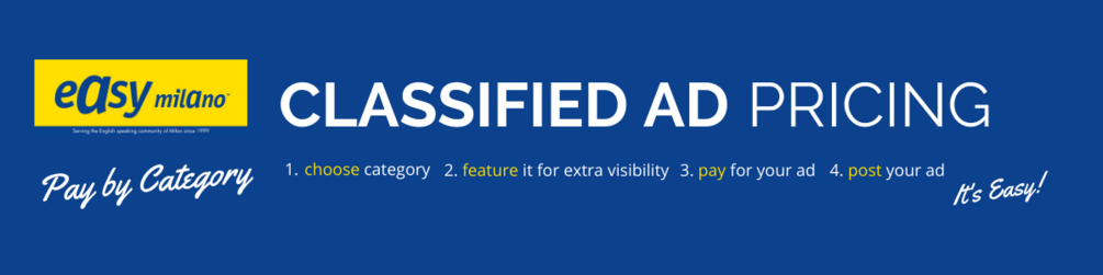 Please note the prices do not include 22% VAT. This will be added automatically when submitting payment. Payments are processed through Gumroad in the U.S.A. Classified ads appear solely online and are no longer printed in Easy Milano magazine.